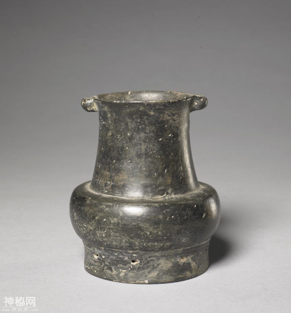 龙山文化黑陶双系壶,目前我国出土的黑陶 文物制品以龙山文化出土最多、最为精致。
