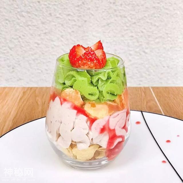 这是抹茶与草莓的碰撞,淡淡的苦和清爽的酸甜,中间和垫底的玉米片起着画龙点睛的作用。