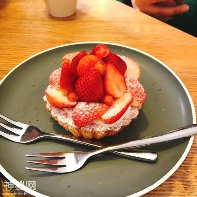 酥脆的挞底上面全是草莓,撒上糖霜,我不想叉着吃,我只想把嘴张得比王大陆还大,一口给吃光。