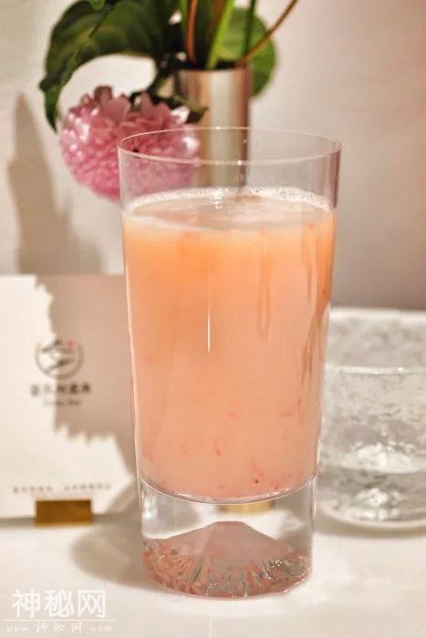 杯底做成了富士山的模样,粉红色的草莓米浆把富士山给投射得很美,喝起来微微甜,很清爽。