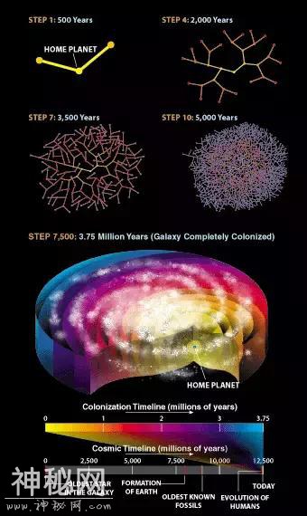 对于星际殖民的方法,有一种假想,就是创造一种能够航行到别的行星的机器,然后用利用新行星上的材料花 500 年左右的时间自我复制,然后将两个复制品送向下一个目标,即使用比光速慢的多的速度航行,这个模式也能用 375 万年的时间完成整个星系的殖民。
