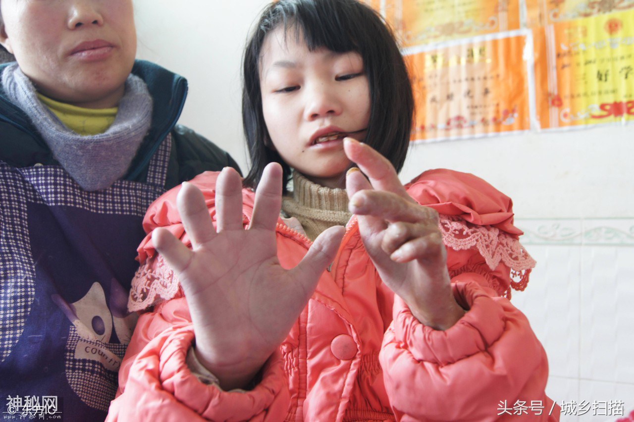 那一天,女孩突然 发现全身发痒,并带剧痛,嘴唇和手指发白,老师和家长以为是劳累引起的。过了几个月,发现大腿上的皮肤逐渐变硬,然后硬皮脱落,脱壳的地方肌肉开始溃烂,面积越来越大,周围的皮肤呈黑色。然后又变硬,脱落,腐烂……周而复始,温度高时还爬出了蛆虫,直至手指和脚趾一级一级脱落。图为女孩展示脱落的手指。(图片来自东方IC)