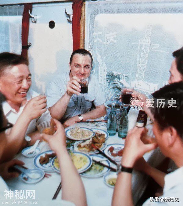 与外国人在餐车举杯就餐的中国人