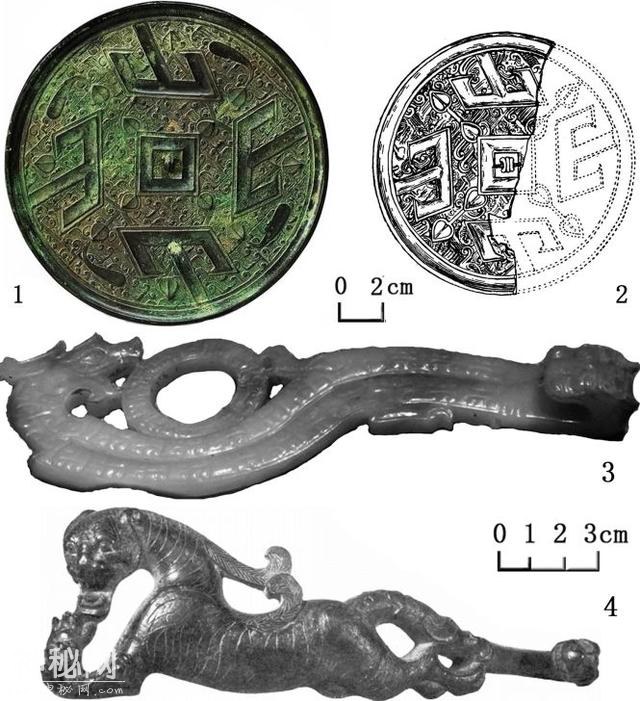 图13 13-1.长沙燕山岭 M855 楚墓出土的山字镜;13-2.巴泽雷克二号陵墓出土的山字镜;13-3.南越玉佩 III(D45),长 18.9 厘米、宽 6.2 厘米,重 129 克;13-4.大英博物馆收藏腰铜佩(编号1945,1017.198),长 16.5 厘米 讨论中国文化对斯基泰艺术影响多限于上述丝织物品、铜镜和漆器三类,因为这是通过远程交易传入中亚的产品。如李建深的研究证明,楚地生产丝织品和铜镜,在春秋战国时发展成为规模庞大的专业化生产行业,远地销售到达华北、北亚、中亚地区,所以巴泽雷克文化墓里也出土生产于楚国的商品。但除了器物流动,也包括东亚古文明对草原地带文化的组成所产生的影响,其中就包括一些技术和艺术造型。 战国时期,华北及黄河流域诸国与草原关系频繁,西汉早期因匈奴的关系,互动可能还要多。仔细观察草原发现的虎形腰饰(图13-4),其老虎的龙形尾巴造型在战国秦汉艺术中颇为常见,如可以对照南越王墓的虎龙玉佩(图13-3),而小翅膀形状与战国秦汉有翼蟠虎造型一致(如参后文图23、图24)。从南海到草原都可见技术和形象接近的器物。在草原地带,西亚、东亚造型风格和主题都混为一团,如兽型金牌,一方面其有很明显的西亚源头,另一方面东亚也有自身原创的兽型金牌艺术,如三星堆金虎(图14-2)等。新疆阿拉沟墓地出土的金牌中,既有与中国大量制造的翼蟠虎类似的造型(图14-4、图14-5),亦有似蟠狮的造型,其狮鬣向上卷而像翅膀(图14-3)。可见,草原艺术一边传西来的狮鹫,一边重新吸收中国化的老虎和其他艺术主题。李零曾有发现,中国开始出现狮子造型的同时,源自中国老虎的形象亦传到中亚地区。实际上很多战国艺术家塑造的形象,后来传到草原和中亚。