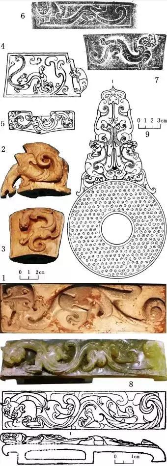 图23 23-1 至 23-3.战国末期长沙墓出土翼螭虎玉剑饰:23-1.玉剑璏;23-2、23-3.玉剑珌;23-4 至23-7.南越王墓无翼螭虎玉剑饰:23-4.玉剑珌C147-12,通长4厘米、最宽6.8厘米、中厚 1.7厘米、重80克;23-5.玉剑格C147-10,通宽6厘米、中厚1.95厘米、重28.7克;23-6.玉剑璏C147-7,通长9.9厘米、宽2.5厘米、通厚1.5厘米、重59.2克;23-7.玉剑珌 C148-8,通长 3.4 厘米、最宽 7.4 厘米、通厚1.8厘米、重99.7克;23-8至23-9满城中山靖王刘胜墓玉器:23-8.1-5042剑璏,通长9.7厘米、通宽 2.3 厘米;23-9.1-5048 璧,通长 25.9 厘米、璧外径13.4厘米、璧内径4.2厘米、厚0.6厘米
