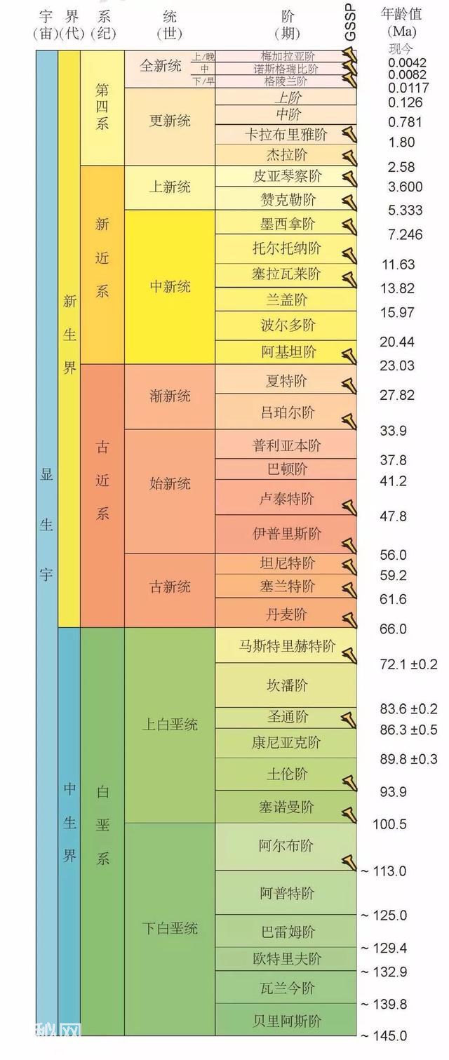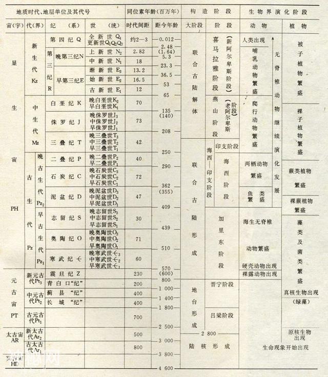 宙下面又对应划分了5个大的代:太古代、元古代、古生代、中生代、新生代;5个代之下又对应划分了12个纪,这就是常说的5代12纪。